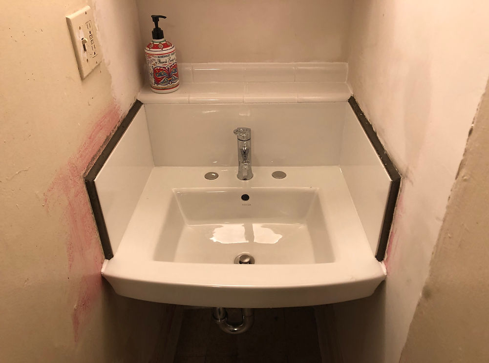 I found a new sink that fit the alcove in this studio apartment in San Francisco. The pink stuff is a bonding agent I used in preparation for a fresh coat of plaster in this area.